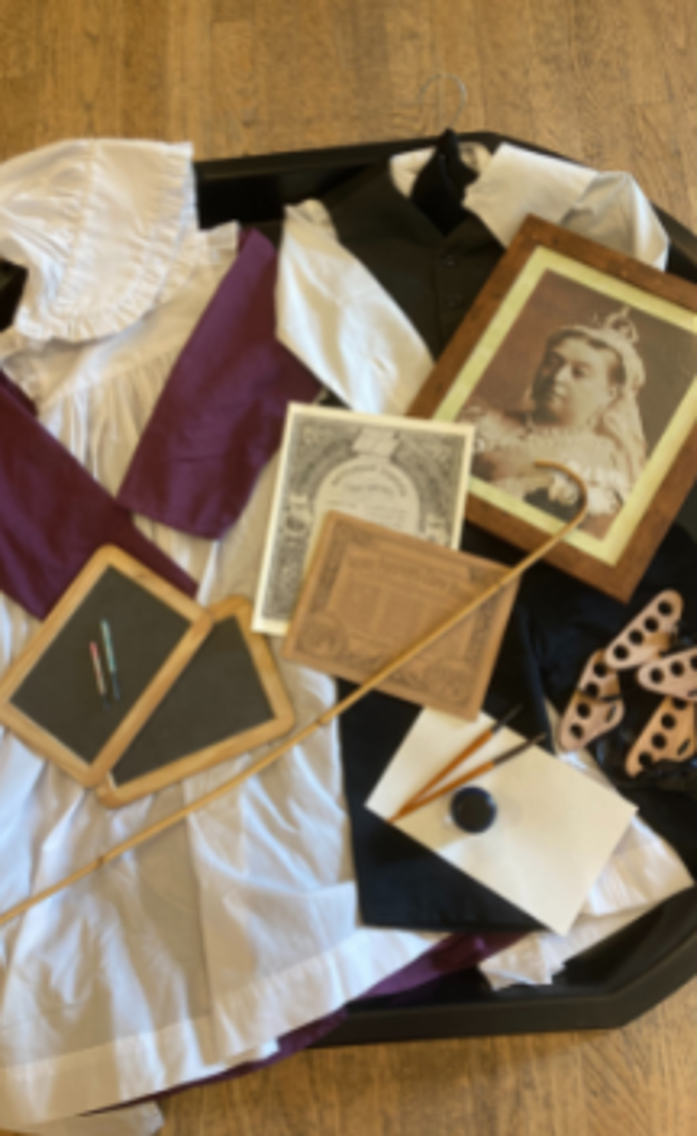The contents of this box are all replicas as we intend children to use them to recreate Victorian school life.