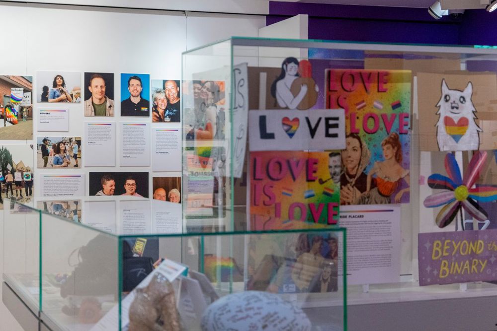 The Behind the Rainbow exhibition with portraits on the wall and signs in a display case.